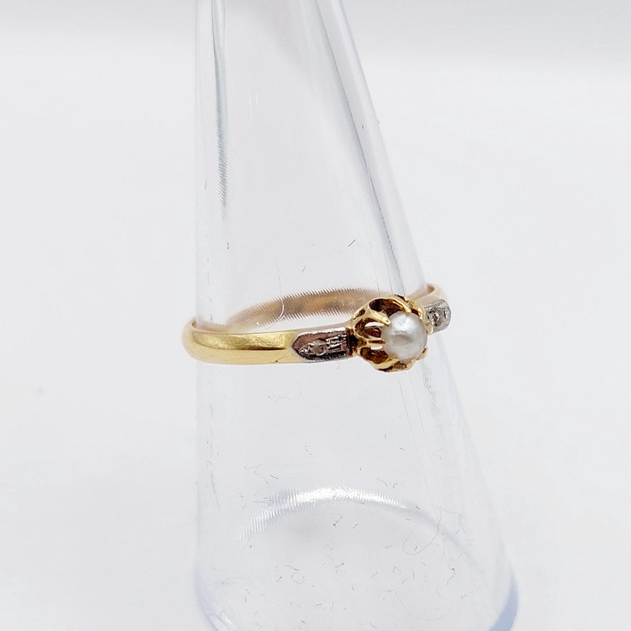 French art deco ring 18k gold and platinum set with a pearl shouldered with rose cut diamonds (circa 1920)