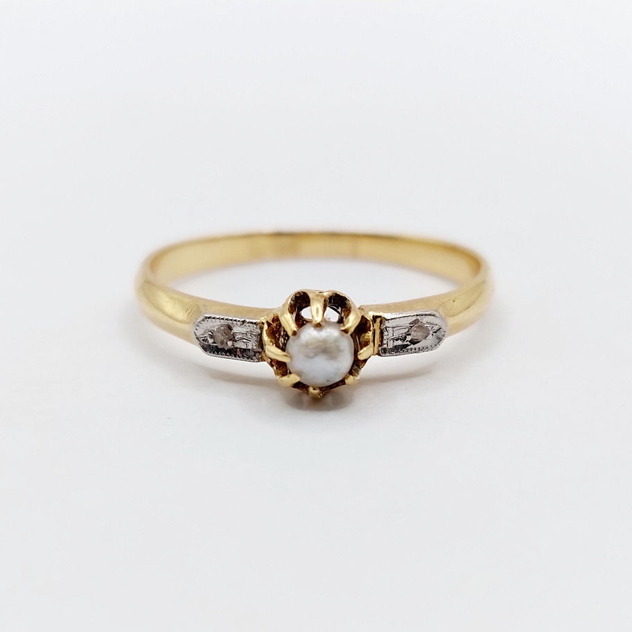 French Art Deco ring 18k gold pearl rose cut diamonds 1920s