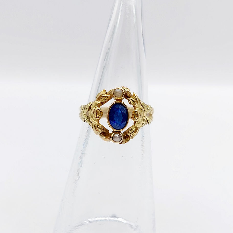 Bague art nouveau or 18k pierre bleue, perles et fleurs (circa 1910)