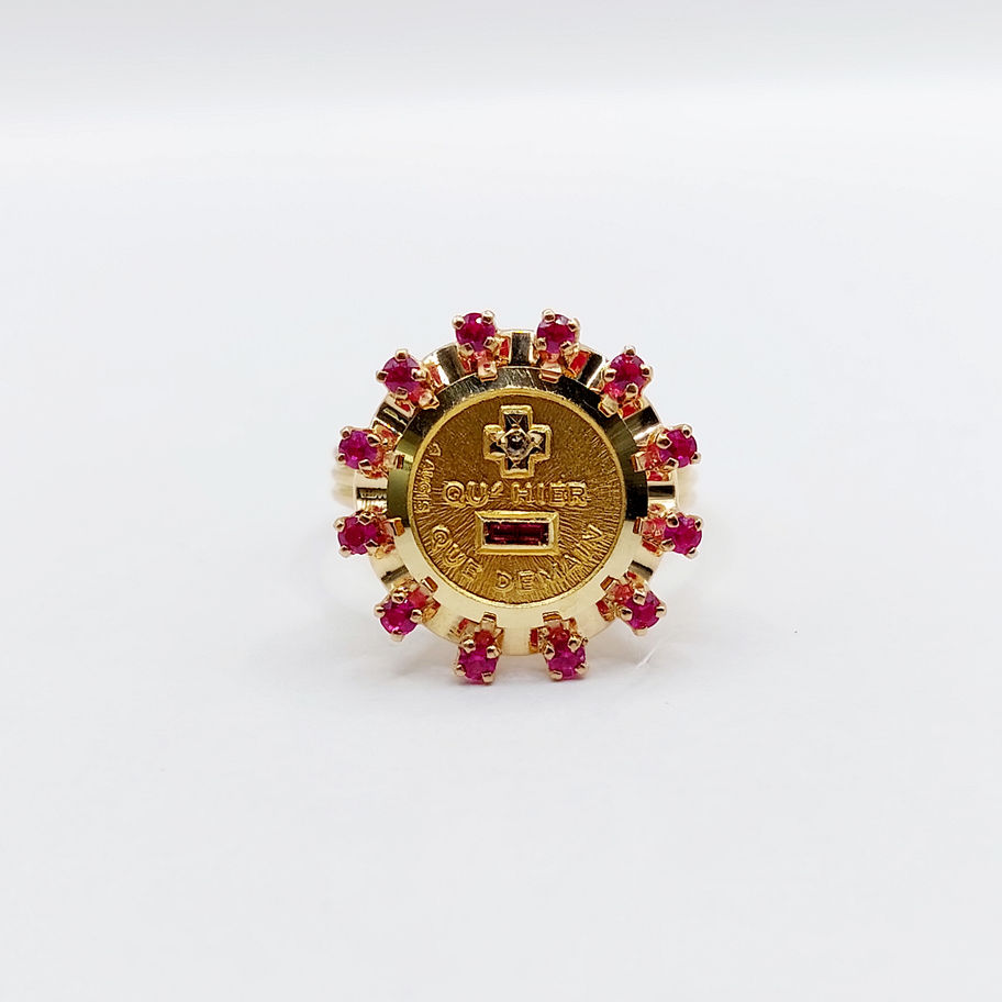 Bague cocktail AUGIS médaille amour or rose 18k "+ qu'hier - que demain" ornée de rubis synthétiques et d'un diamant (circa 1970)