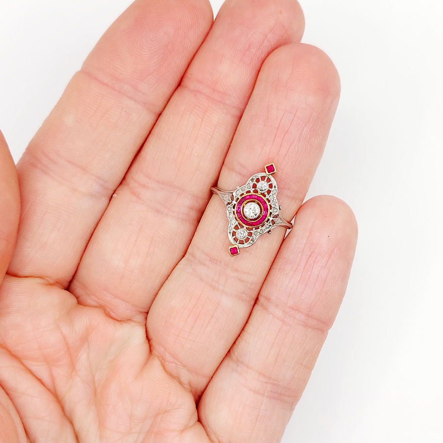 Bague marquise art deco Platine diamant et rubis synthétique (circa 1910)