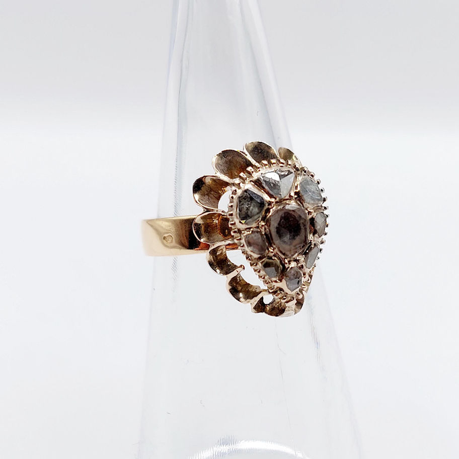French victorian marquise ring 18k rose gold pear shapped set with rose cut diamonds in illusion settings in a finely chiseled mounting (circa 1870)