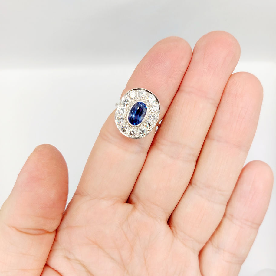 Bague pompadour art deco or blanc 18k saphir synthétique, 1.20 carat de diamants