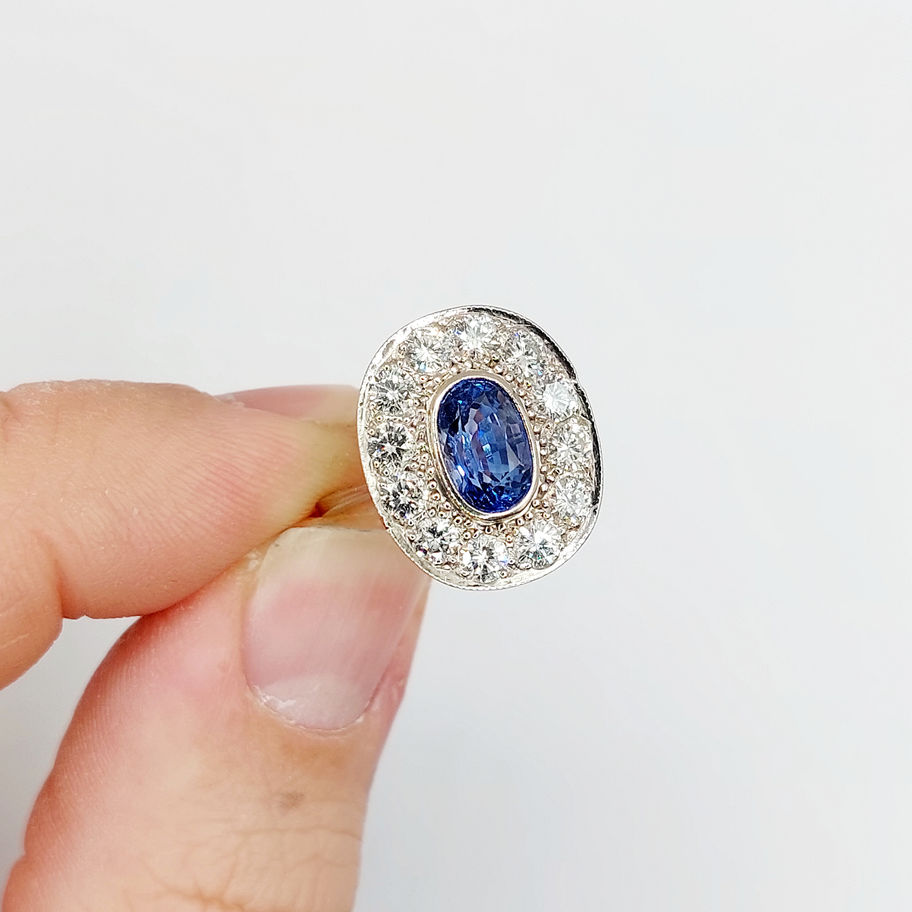 Bague pompadour style art deco or blanc 18k ornée d'un saphir synthétique de 1,60 carats entouré de 1,20 carats de diamants tailles brillants