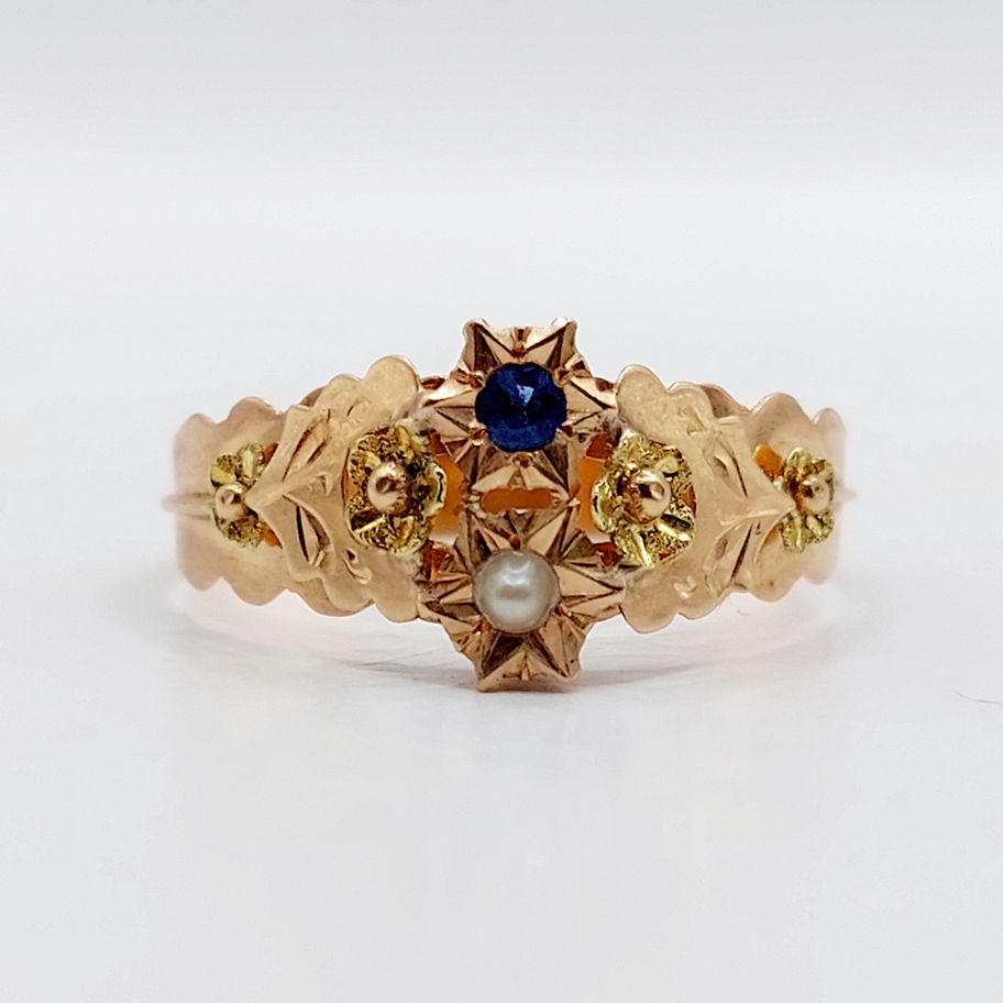 Bague toi et moi antique or rose 18k ornée d'une perle et d'une pierre bleue dans une monture finement ciselée de fleurs (circa 1900)