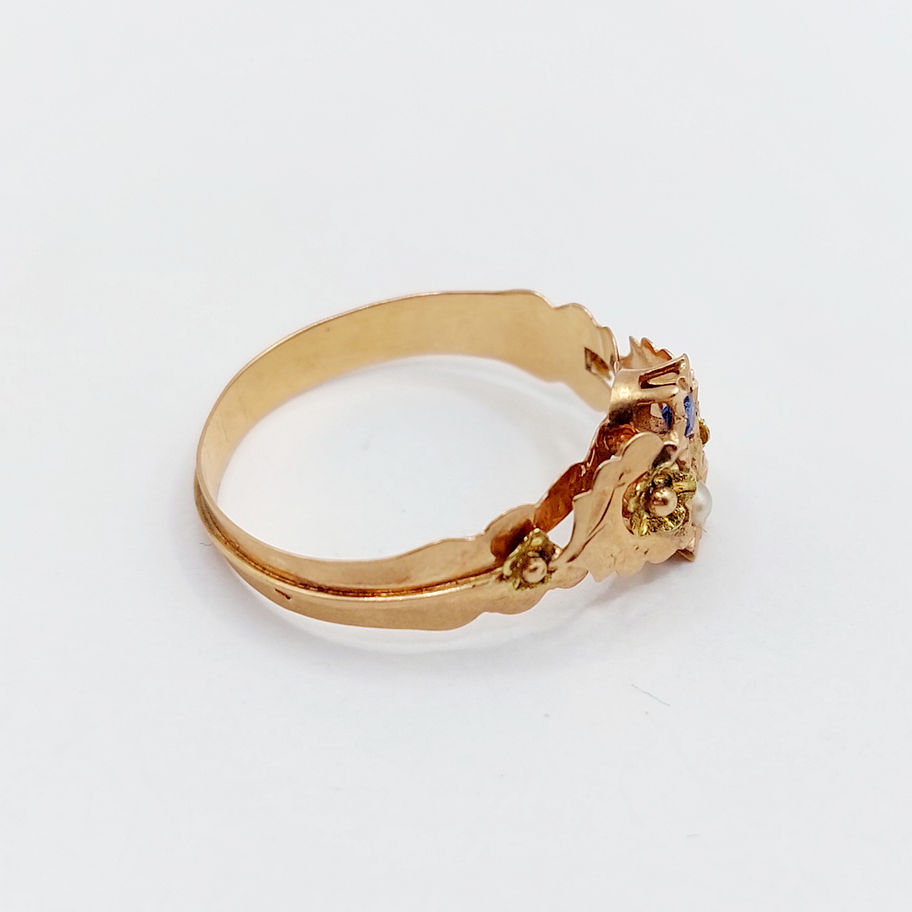 Bague toi et moi antique or rose 18k perle, pierre bleue et fleurs (circa 1900)