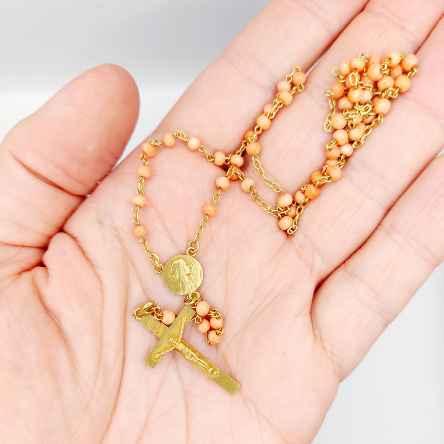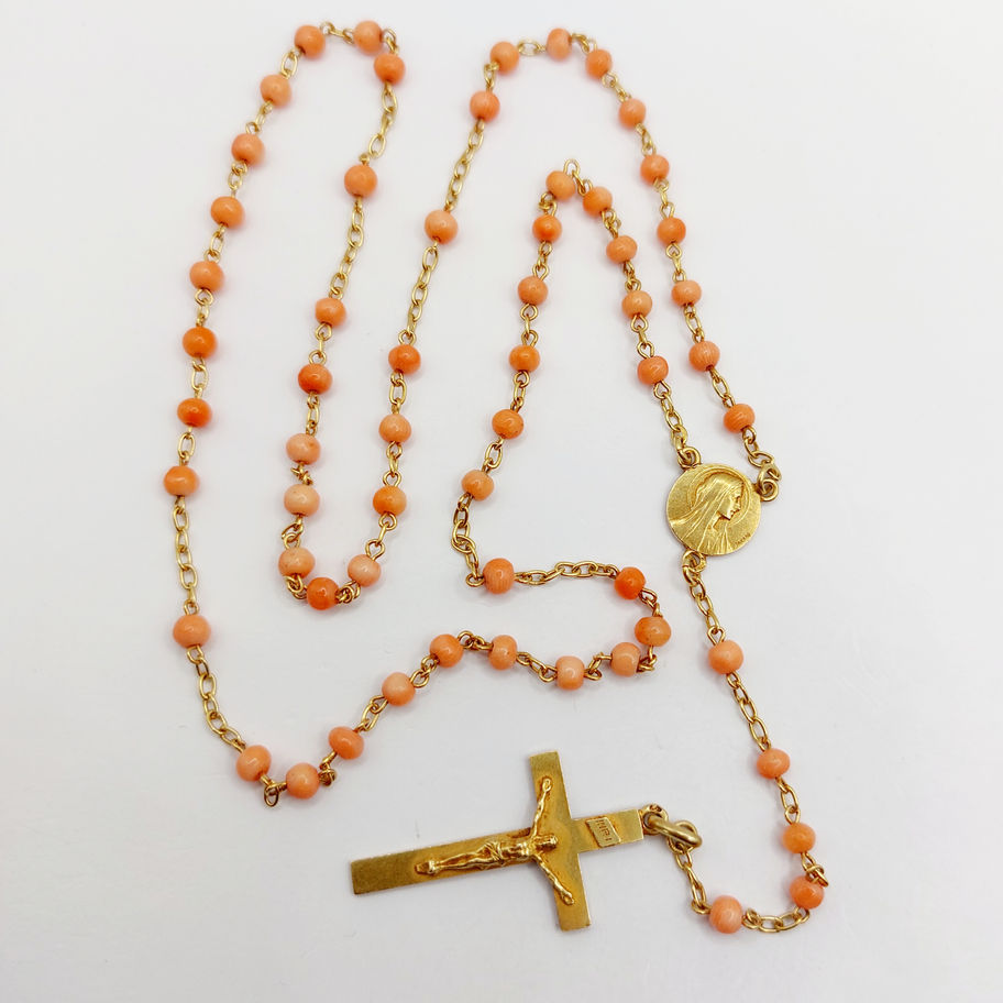 Chapelet antique or 18k finement travaillé et ornée de billes de corail et d'une médaille de la Vierge Marie et d'une croix au Christ crucifié (circa 1919)
