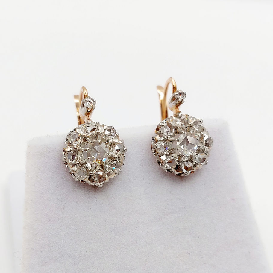 Dormeuses marguerite antique or rose 18k et platine ornée de diamants taille roses (circa 1900)