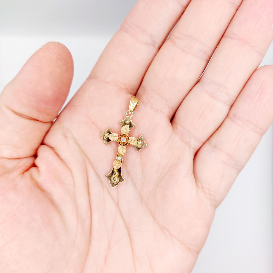 Pendentif croix antique or rose 18k orné d'un diamant taillé en rose et de perles dans une monture finement ciselée (circa 1900)