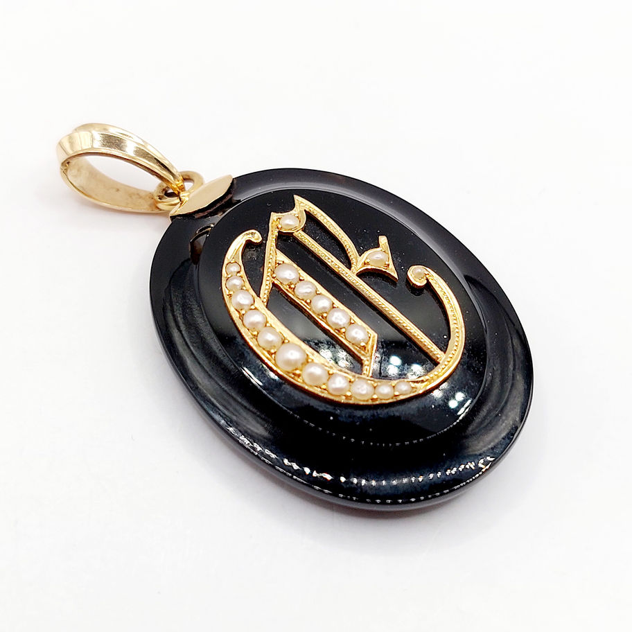Pendentif XXL porte photo antique or 18k onyx orné de perles et des lettres CR (circa 1900)