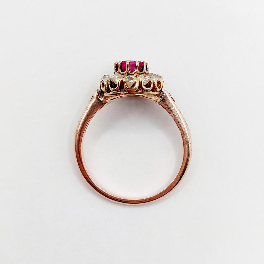Bague marguerite antique or rose 14k ornée d'un rubis synthétique entouré de diamants taillés en roses (circa 1920)
