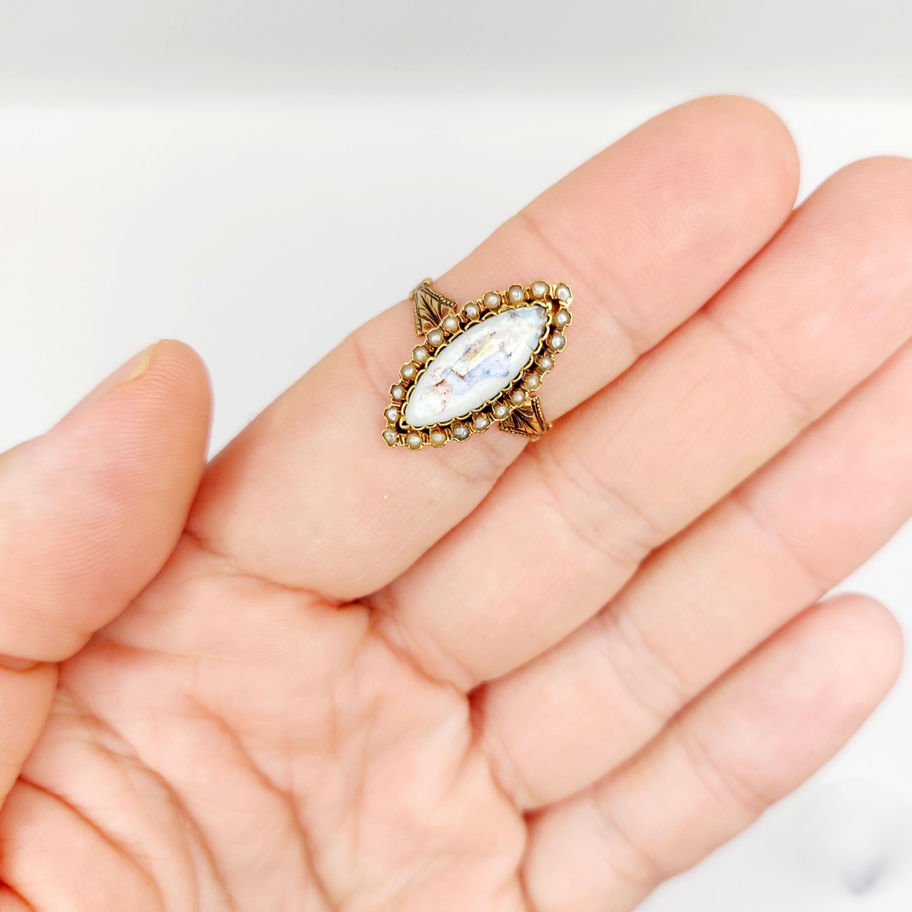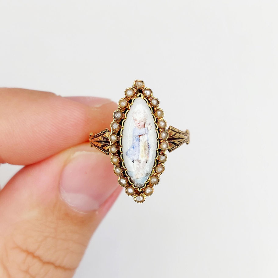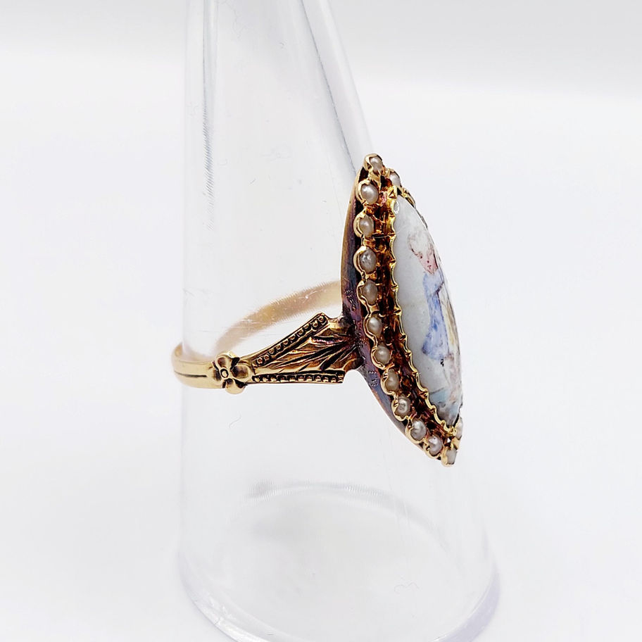 Bague marquise antique or 18k ornée d'une plaque de céramique représentant une chérubin ou un enfant entournée de perles (circa 1880)
