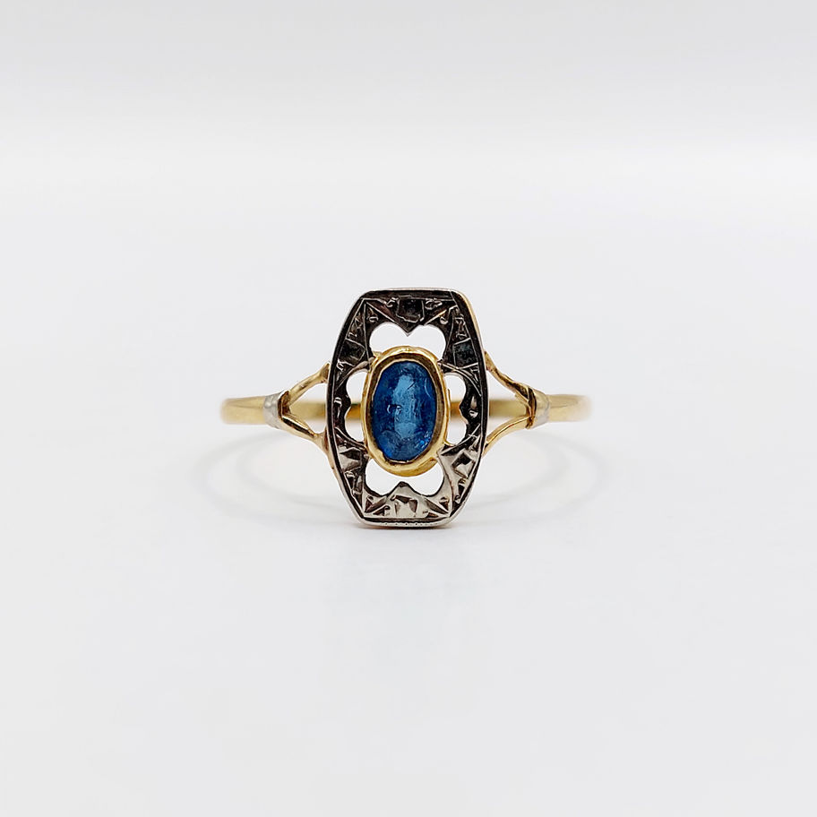 Bague art deco or 18k monture géométrique et pierre bleue (circa 1930)