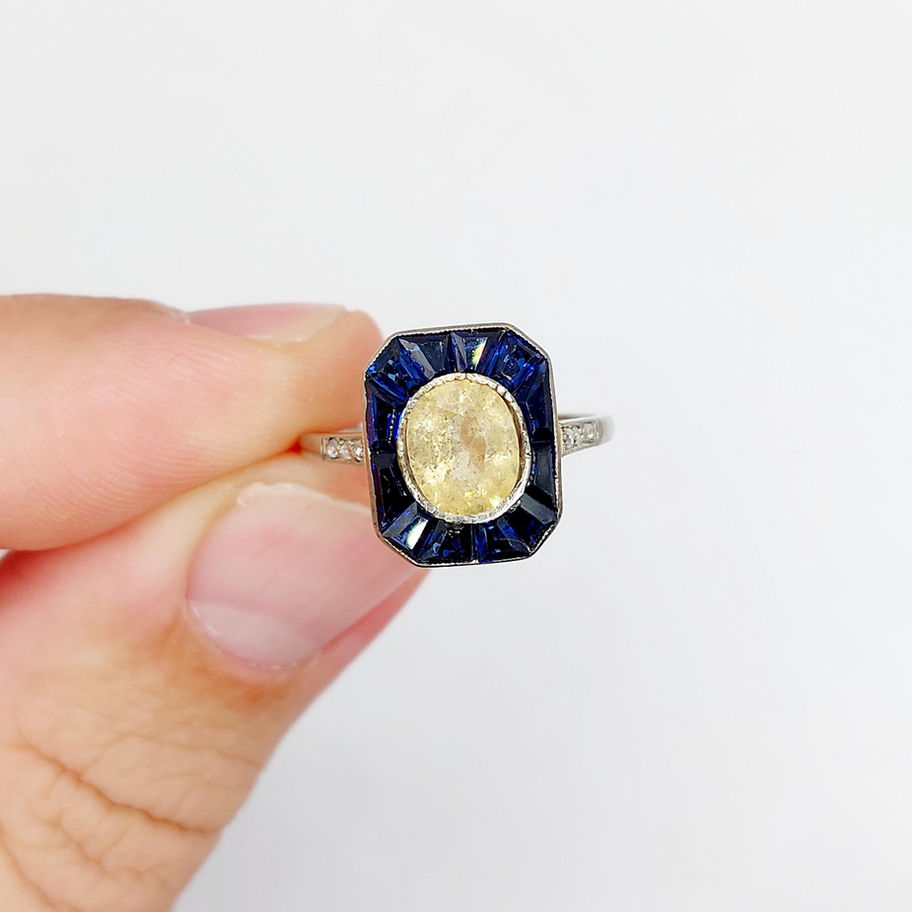 Bague art deco or blanc 18k ornée d'un saphir jaune naturel de 1,30 carat entouré de saphirs calibrés synthétiques et de diamants taille roses (circa 1930)