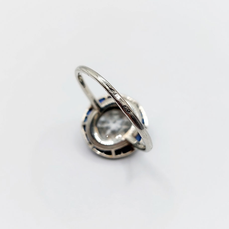 Bague cible art deco or blanc 18k ornée d'un diamant taille ancienne de 2,40 carats entouré de saphirs calibrés (circa 1920) Française
