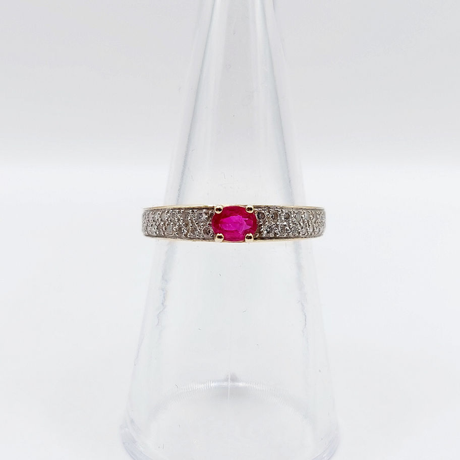 Bague jonc vintage or 18k ornée d'un rubis et d'un pavage de diamants dans une monture finement travaillée (circa 1970)