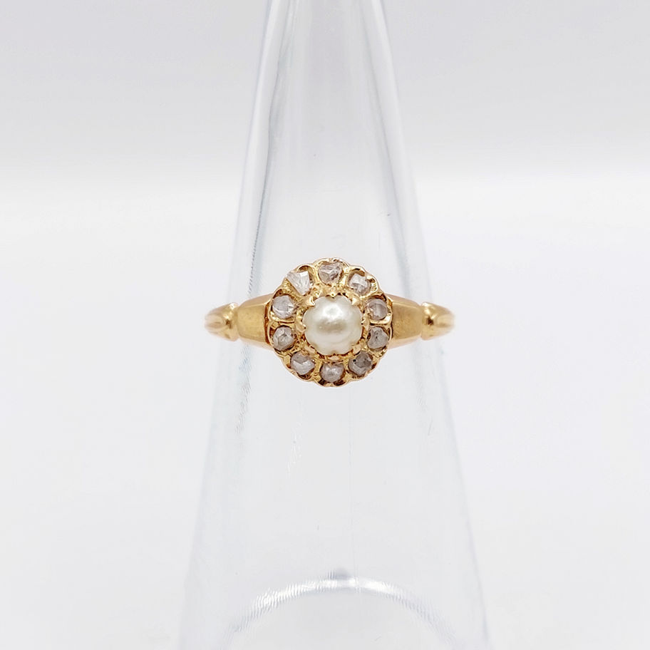 Bague marguerite antique or rose 18k ornée d'une perle entourée de diamants taillés en roses (circa 1900)