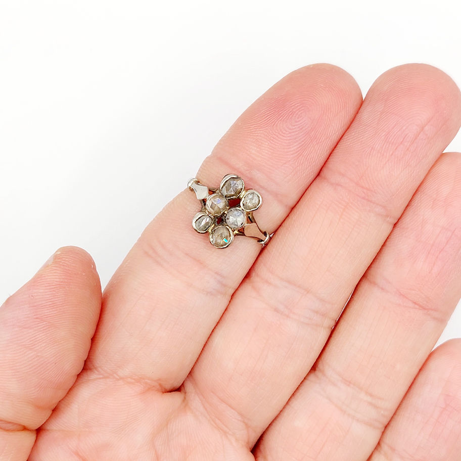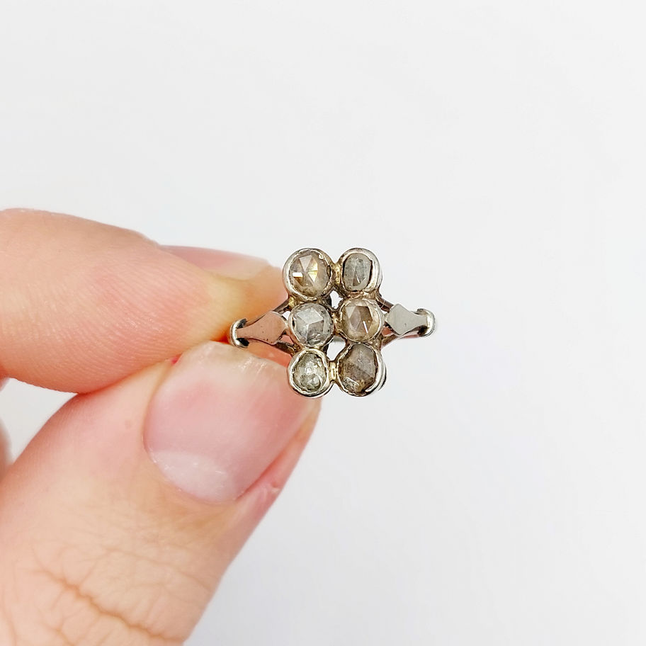 Bague marquise antique or blanc 18k ornée de diamants taille roses sertis clos sur paillons (circa 1900)
