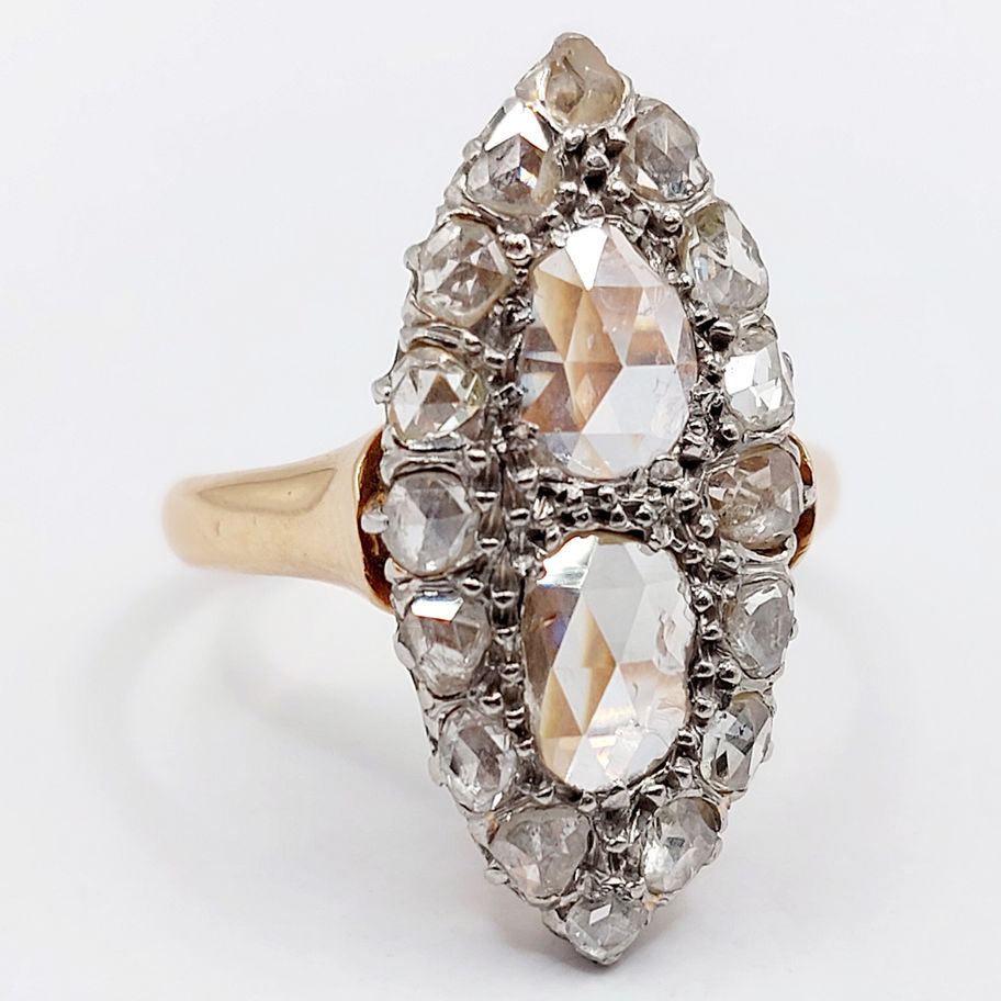 Bague marquise antique or rose 18k et platine ornée de 1,05 carats de diamants taillés en roses (circa 1900)