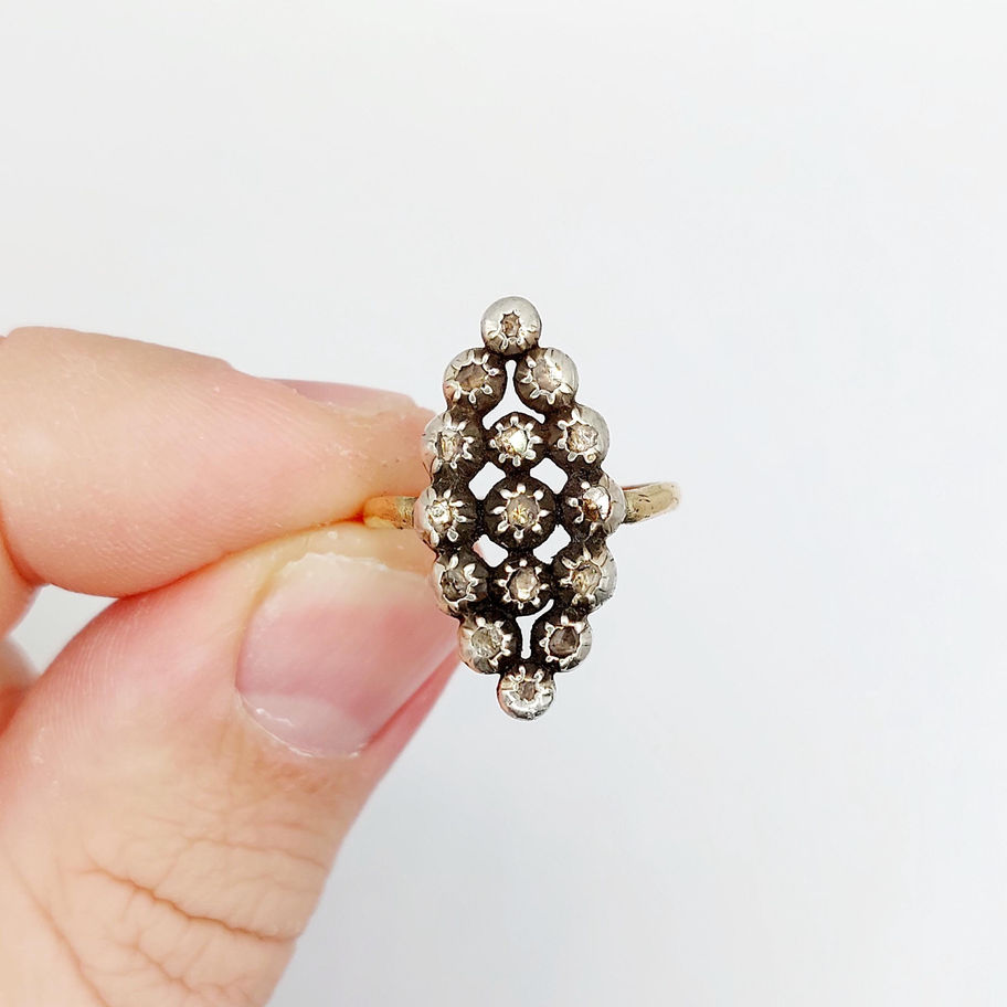 Bague marquise victorienne or 18k et argent ornée de diamants taillés en roses en serti étoilés clos sur paillons (circa 1850)
