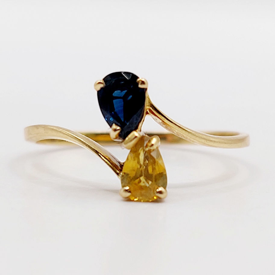Bague toi et moi vintage or 18k ornée de saphirs jaune et bleu taille poire