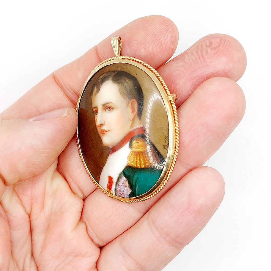 Broche pendentif antique or rose 14k ornée d’une porcelaine émaillée au portrait de Napoléon Bonaparte (circa 1880)