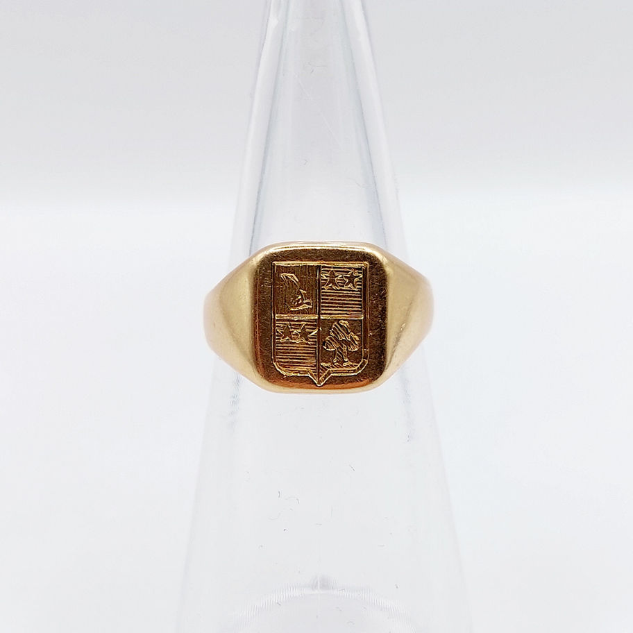 Chevalière antique or 18k armoiries française années 1920 étoile aile trèfle