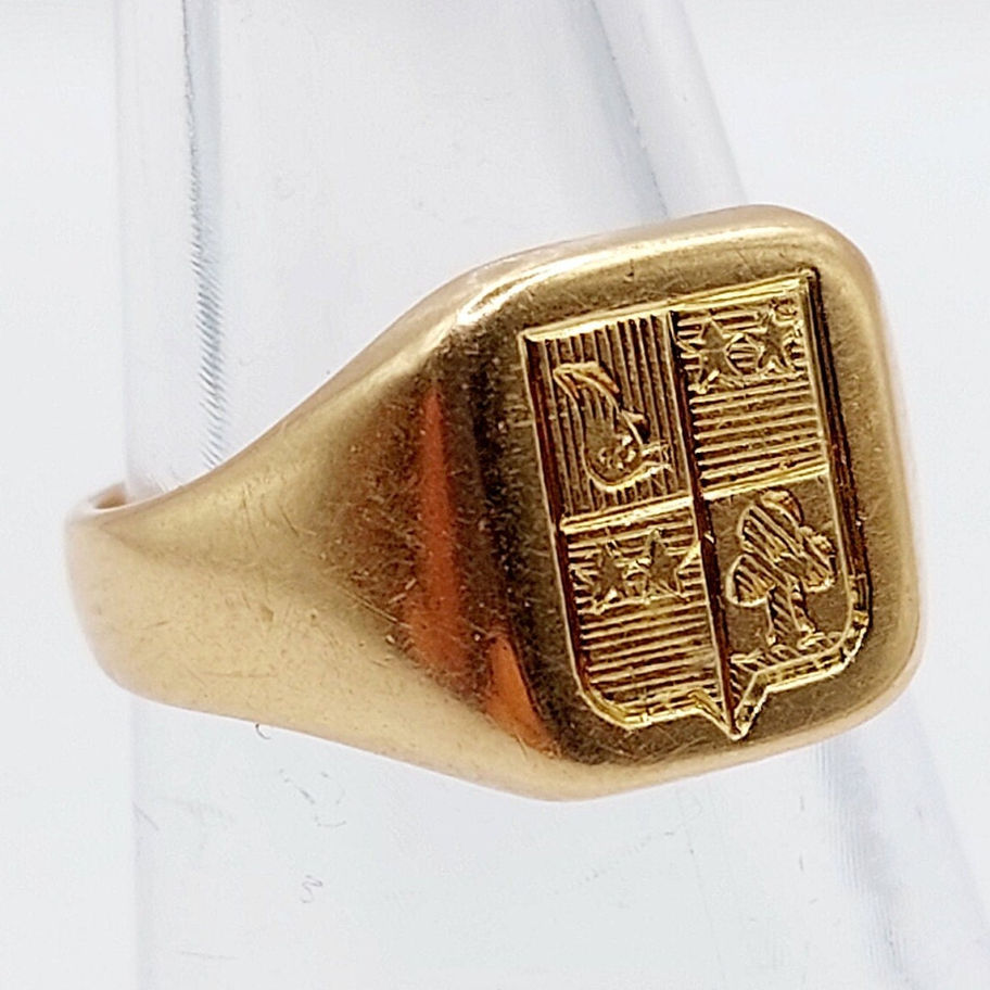 Chevalière antique or 18k armoiries française ornée d'un blason composé d'étoile, d'une aile et d'un trèfle (circa 1920) sceau, chevalier