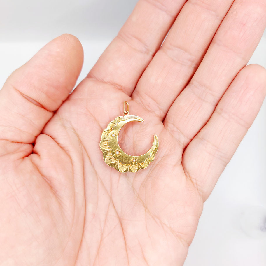Pendentif antique or rose 18k formant un croissant de lune ornée de perles en sertis étoilés (circa 1900)