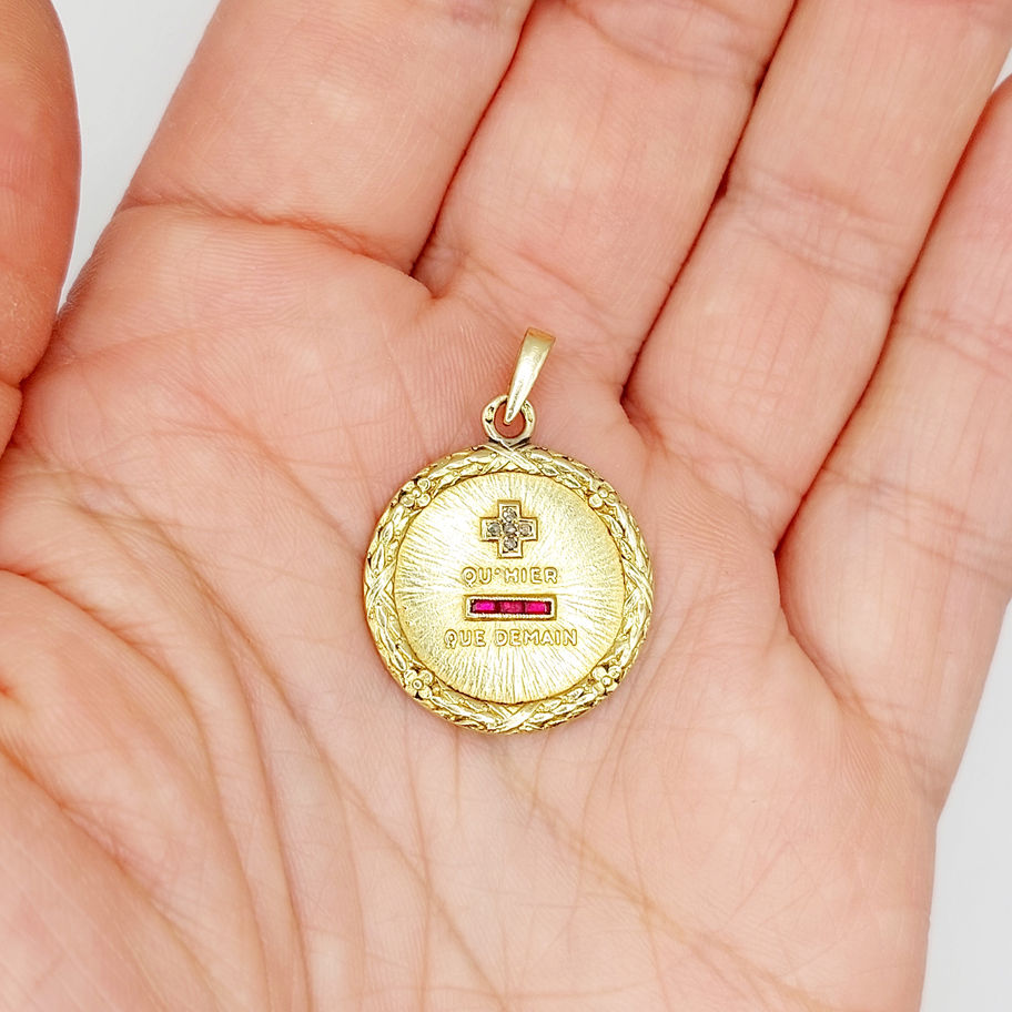 RARE Pendentif médaille d'amour 23mm AUGIS or 18k diamant et rubis : "+ qu'hier - que demain" couronne de laurier (circa 1952)