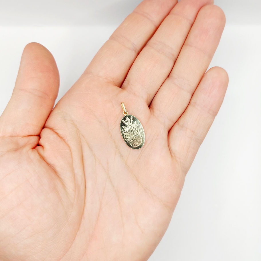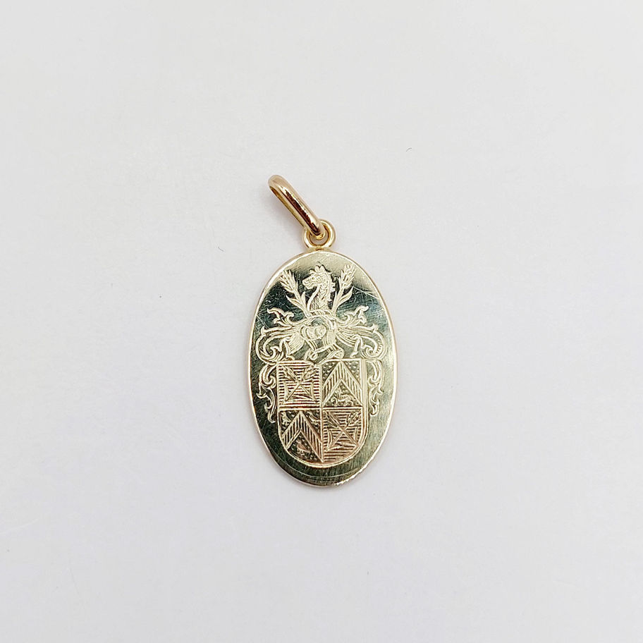 Pendentif antique or 14k formé d'une plaque gravée d'une armoirie surmontée d'un heaume et d'une tête de cheval (circa 1880)