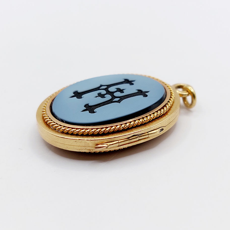 Pendentif porte photo antique or rose 18k orné de plaques d'agate gravé de la lettre H (circa 1900)