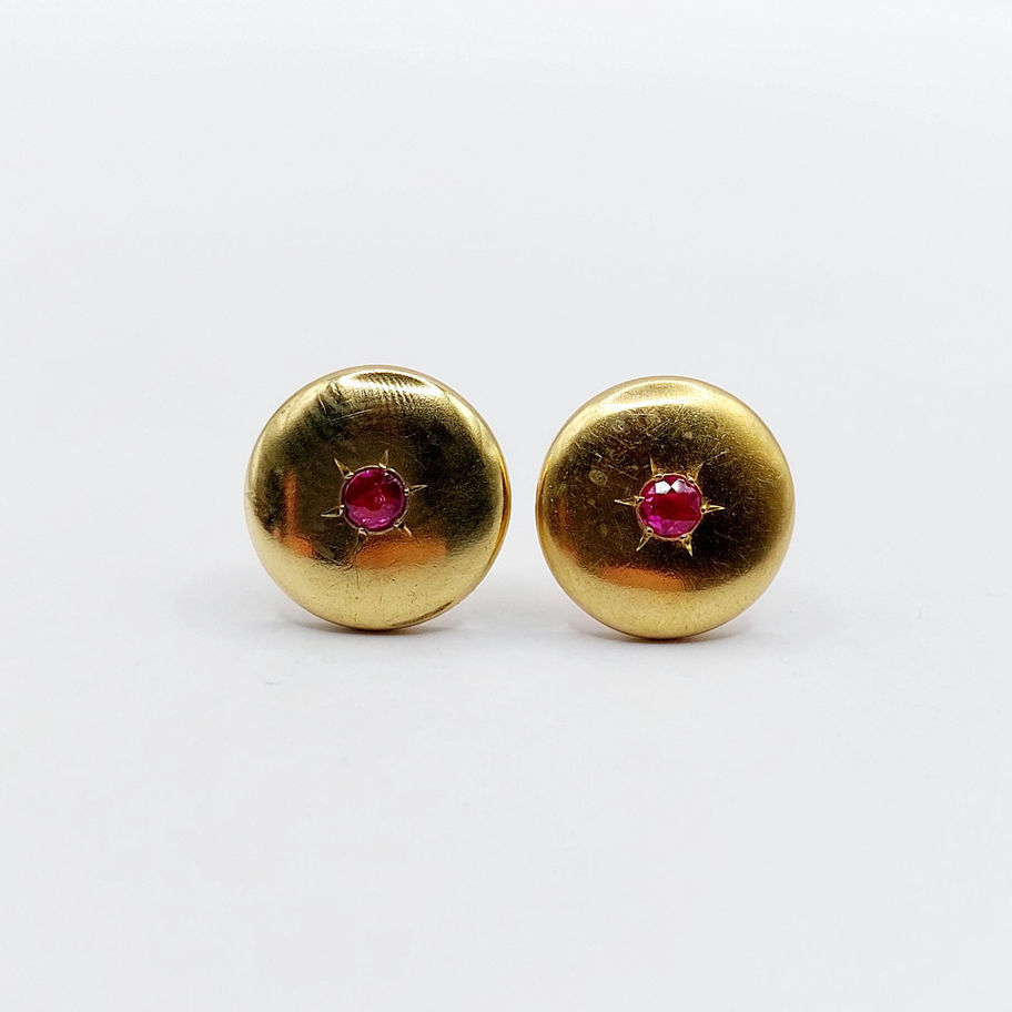 Puces d'oreilles art deco or rose 18k disques ornées de rubis années 1940