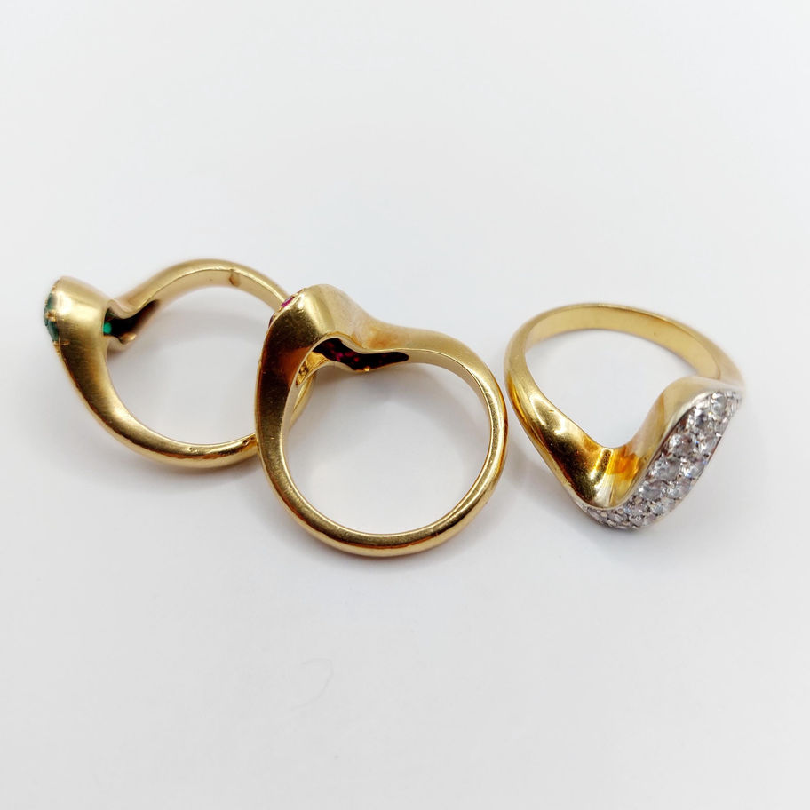 Trilogie de Bague jonc vintage or 18k pavé diamants émeraude rubis années 1980