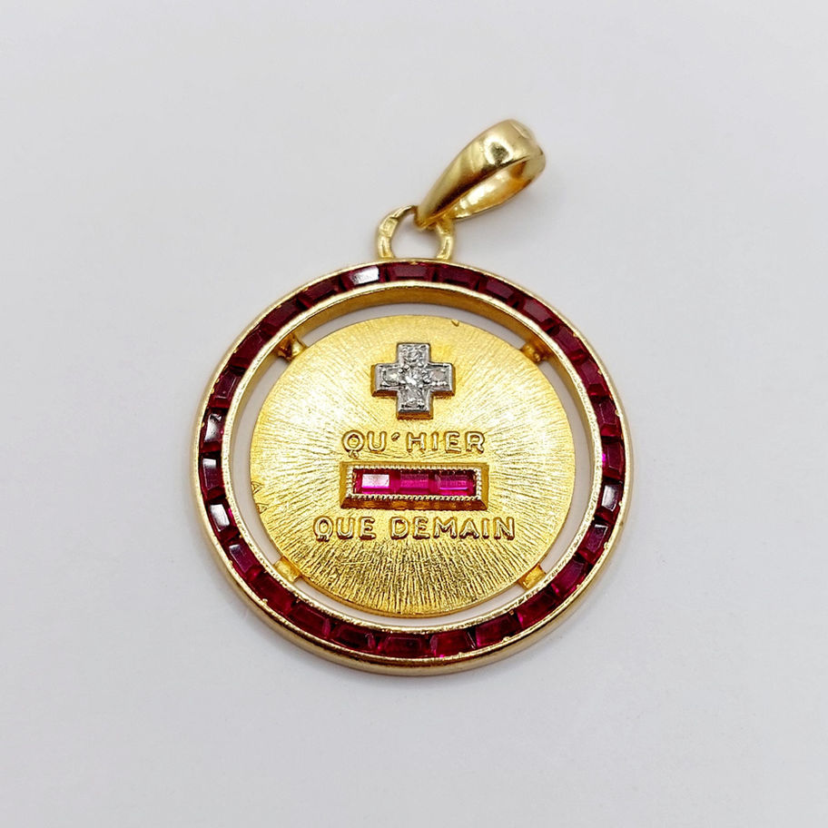 ULTRA RARE Pendentif médaille d'amour 23mm or 18k diamant et rubis calibrés : "+ qu'hier - que demain" maison AUGIS (circa 1960)